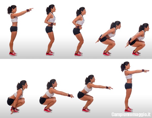 Lo squat necessità di un numero consistente di ripetizione per determinare effetti significativi. Si suggerisce tuttavia, per non sovraccaricare il sistema muscolare, di non eccedere con le ripetizioni, specie nelle prime settimane di attività fisica. Una buona idea potrebbe essere quella di iniziare con dieci ripetizioni al giorno, per poi incrementare nelle settimane successive, fino ad arrivare a un massimo di cento ripetizioni al giorno.