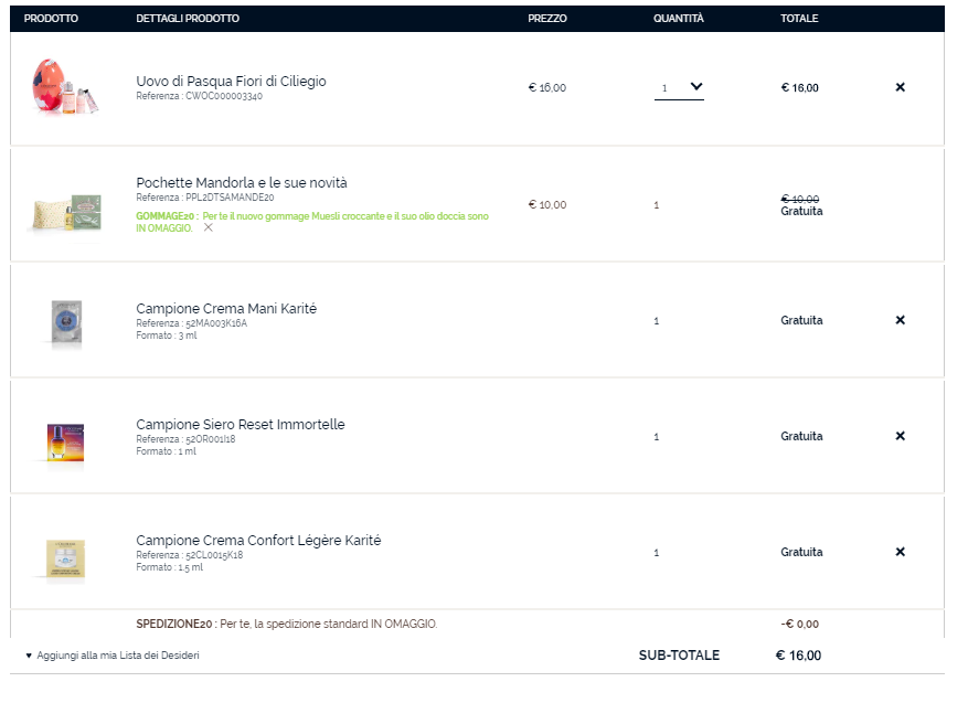 Io per esempio ho aggiunto al carrello un uovo di pasqua L’Occitane en Provence con alcuni prodotti iconici, quindi ho inserito il codice vinto e selezionato tre ulteriori campioncini viso. Pago 16€ in totale!