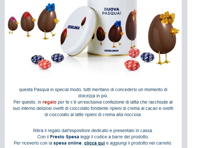 Abbiamo ricevuto via mail un invito da Esselunga per ritirare gratuitamente una confezione di latta con dei cioccolatini (ovetti) fondenti ripieni di crema al cacao e al latte ripieni di crema alla nocciola.