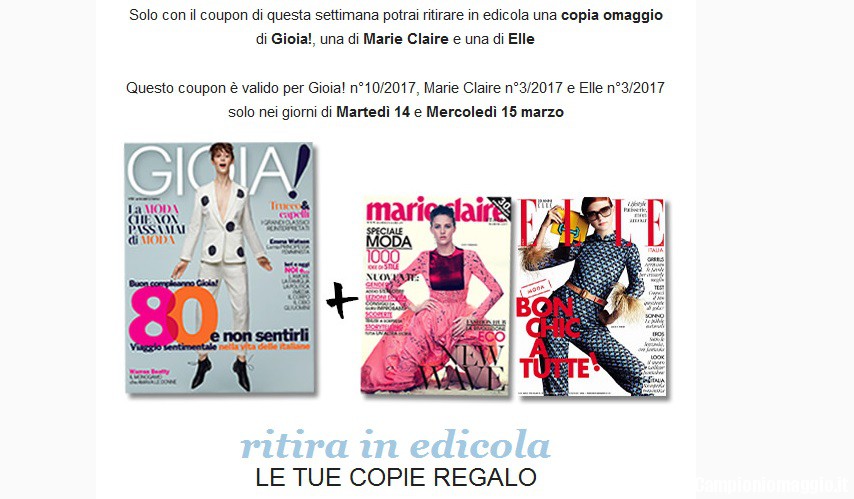 Il buono, che si riceve via mail, è valido per Gioia! n°10/2017, Marie Claire n°3/2017 e Elle n°3/2017 solo nei giorni di Martedì 14 e Mercoledì 15 marzo.
