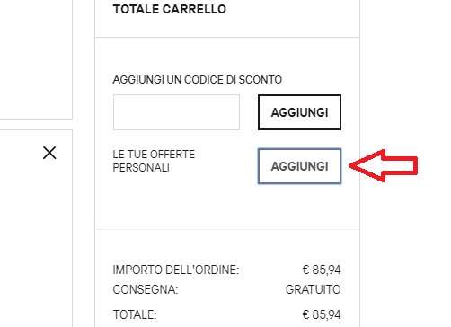 Quando sei all’interno del carrello clicca su “Le tue offerte personali” e seleziona -20% su tutto, come vedi nello screen qui sotto. Salva e vedrai la riduzione immediata dal totale.
