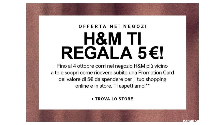 Avete ricevuto la newsletter H&M? Se scorrete fino in fondo la mail troverete una promozione interessate. Fino al 4 ottobre infatti è possibile ricevere nei negozi H&M aderenti una promotion card di 5€ da utilizzare per il tuo shopping! La Promotion Card H&M potrà infatti essere spesa per tutti gli acquisti effettuati dal 12 al 18 ottobre 2015 online e nei negozi H&M in Italia.