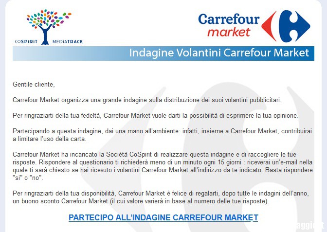 L’iscrizione alla newsletter Carrefour ci ha permesso di ricevere via mail un sondaggio sui volantini che ci frutterà un buono sconto Carrefour. Compilando i questionari infatti riceveremo un buono sconto Carrefour Market (il cui valore varierà in base al numero delle tue risposte).