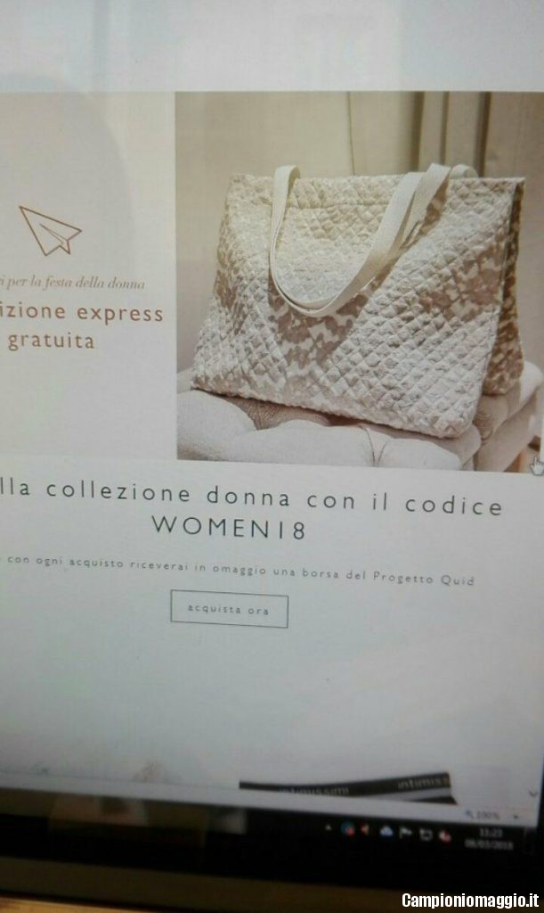 In occasione della festa della donna Intimissimi regala una bellissima shopper e le spedizioni omaggio per chi acquista online. Utilizzando il codice WOMEN18 sullo shop online potrai fare un acquisto di qualunque cifra, avendo le spedizioni express gratis e una borsa in tessuto omaggio.