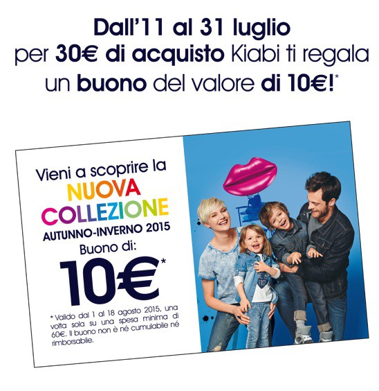 Abbiamo appena ricevuto la newsletter Kiabi che ci avvisa di una interessante promozione valida dall’11 al 31 luglio. Facendo un acquisto di 30 euro si riceve in regalo un buono spesa di 10 euro utilizzabile per un acquisto della nuova collezione, dal 1 al 18 agosto, su una spesa minima di 60 euro. Purtroppo no abbiamo molte altre informazioni su questa iniziativa promozionale Kiabi, perchè sul sito non è presente un regolamento.