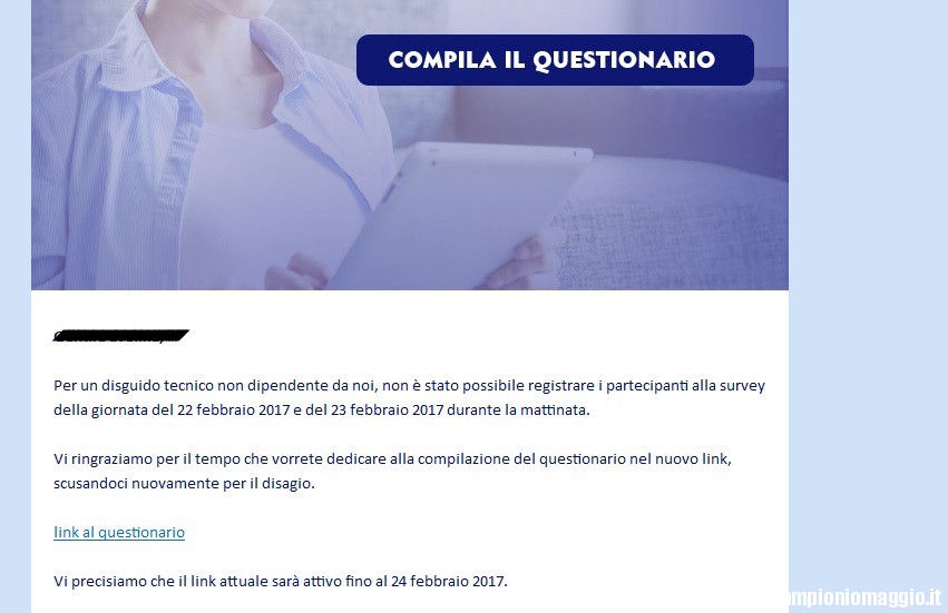 Per questo motivo nella newsletter è contenuto un nuovo link al sondaggio da compilare per ricevere gli omaggi. Controllate quindi la casella di posta per partecipare. Dopo aver completato il questionario, non è prevista alcuna mail di conferma, ma verrai ricontattata successivamente per avviare la spedizione del tuo kit.