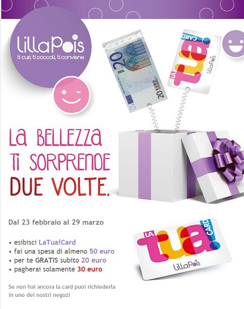 Abbiamo ricevuto la segnalazione di questa offerta via mail. Per sapere dove richiedere gratuitamente la Tua Card, clicca qui e cerca il punto vendita LillaPois più vicino a te. Attualmente questa catena non è ancora diffusa in tutte le regioni italiane.