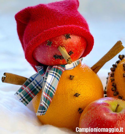 Con una mela ed un’arancia si possono realizzare degli animaletti di frutta: basta porle l’una sull’altra e fissarle con degli stuzzicadenti. Gli occhi e la bocca potranno essere creati con dei chiodi di garofano, mentre il naso si potrà ricavare da un ricciolo di cannella. Per finire si può cucire un piccolo cappellino di lana ed aggiungere una striscia di tessuto a mo’ di sciarpa.