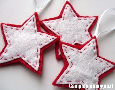 Il feltro è un materiale molto versatile e facile da maneggiare e ritagliare. Per questo è perfetto per essere utilizzato nei lavoretti più piccoli. Può essere tagliato a forma di stelline e poi decorate con l’utilizzo di colla trasparente, qualche perlina e bottone. Con l’aggiunta di un nastrino potranno essere appese all’albero di Natale o ai pacchi regalo.
