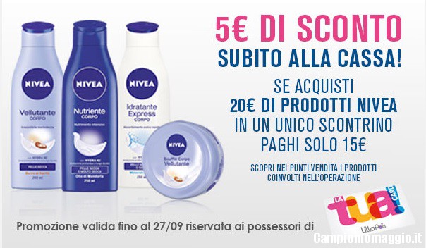 Appena ricevuta nella casella di posta una interessante promozione LillaPois! Fino al 27/09/15 acquistando nei punti vendita aderenti 20€ di prodotti Nivea si riceve direttamente in cassa uno sconto di 5€, pagando quindi solo 15€. Questa offerta è riservata ai possessori di carta fedeltà LaTua! Card. Potrebbe essere l’occasione giusta per fare un po’ di scorta, soprattutto se usate molto i prodotti Nivea.