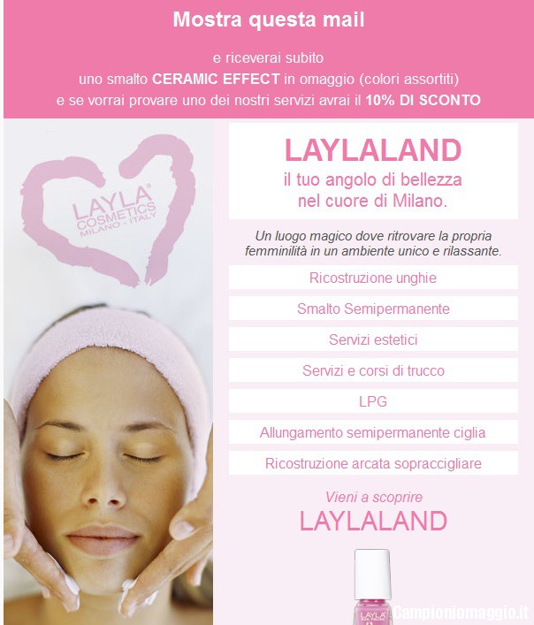 Ancora un omaggio per le amiche di Milano! Layla ha da poco aperto un Via Larga 2 LAYLALAND un logo dove prenderti cura delle tue mani e dei tuoi piedi, dove acquistare i prodotti Layla ma anche usufruire di trattamenti di bellezza su prenotazione. Essendo iscritte alla newsletter Alfemminile abbiamo ricevuto un invito per recarci in LaylaLand e ritirare uno smalto Ceramic Effect omaggio (colori assortiti).