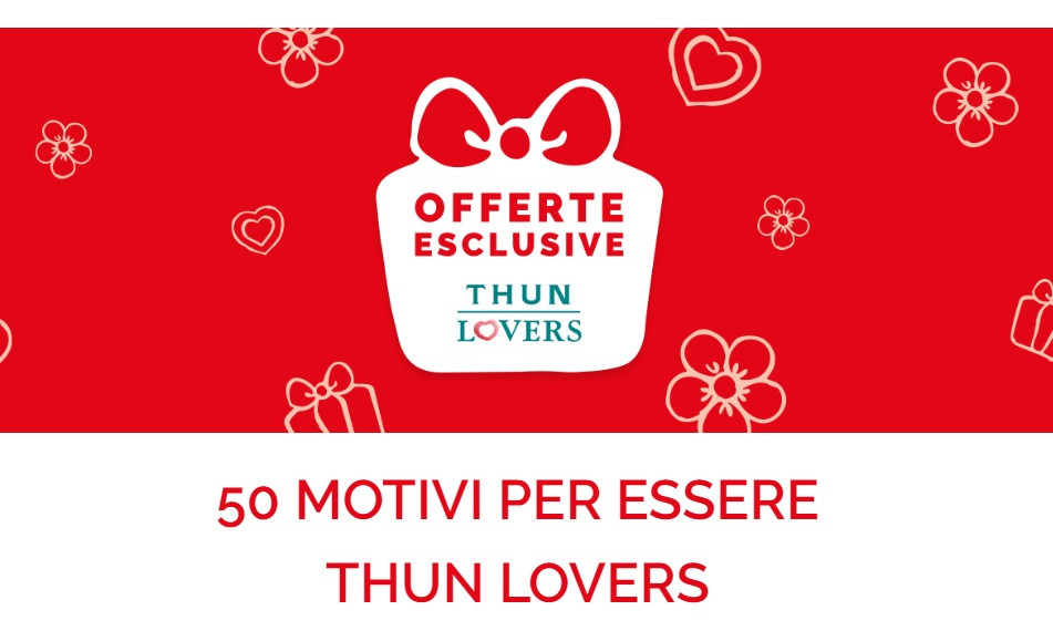 Solo gli iscritti al programma Thun Lovers potranno accedere alle offerte esclusive in negozio e online. Tanti sconti e promozioni sui prodotti più amati da Thun che puoi vedere solo visitando la tua area personale del programma fedeltà online di Thun.