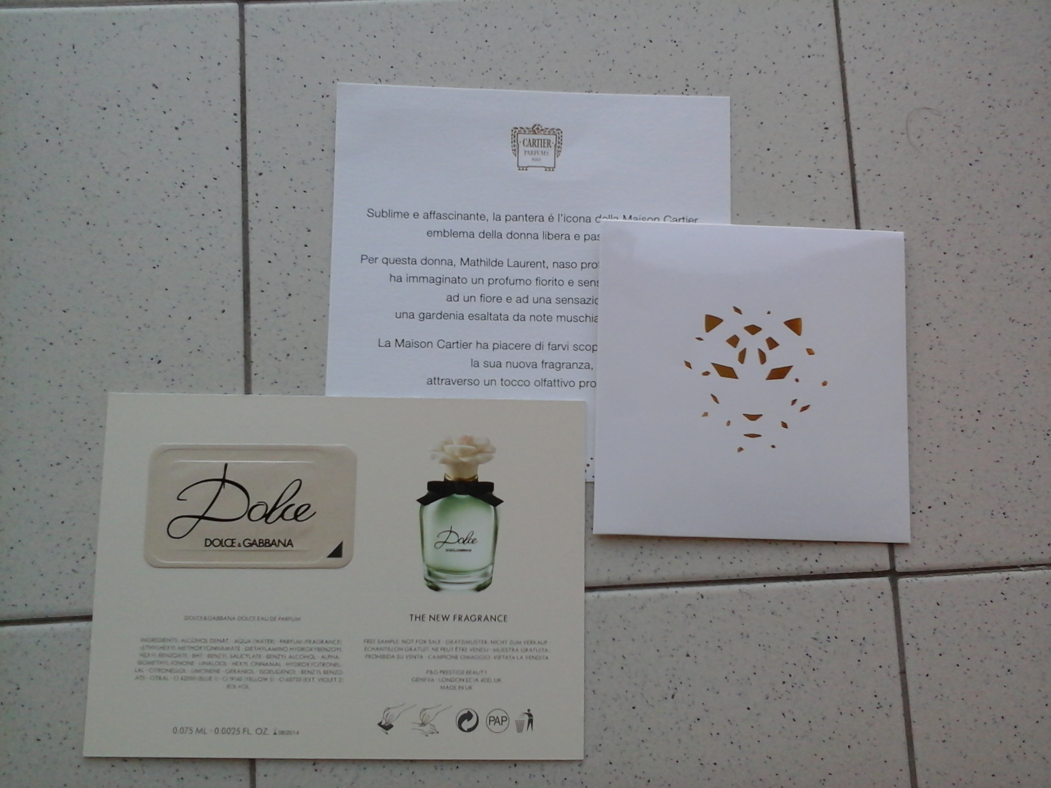 campioniomaggio.it_2014-04-09_17-35-35Era un po’che non ricevevo nulla..ed oggi ben 2 omaggi profumati: il campioncino ‘dolce’ di dolce & gabbana e il cartoncino floreale di Cartier