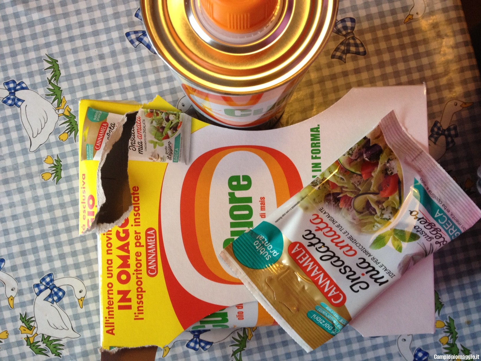 Facendo spese per le feste natalizie abbiamo trovato un omaggio Cannamela nella confezione da 2 latte di olio Cuore. Si tratta di un insaporitore per insalate, per 5/6 porzioni con menta, erba cipollina e aglio.