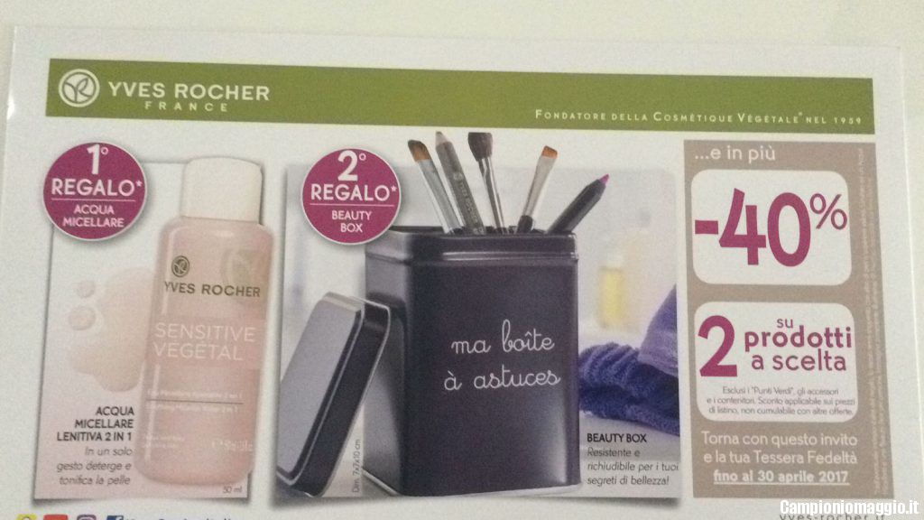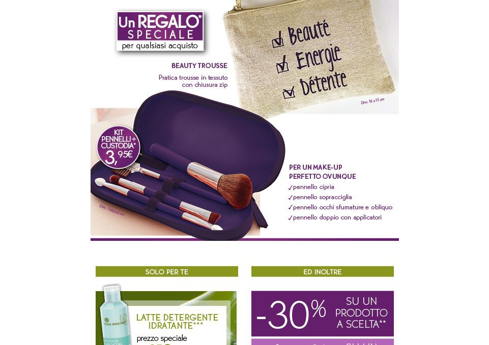 La newsletter invece ci offre una comoda beauty trousse omaggio con un acquisto (anche minimo) e il kit di pennelli + custodia al costo di 3,95€. Inoltre presentandola al personale di vendita mi permetterà di avere uno sconto del 30% su un prodotto a scelta e uno del 40% su un prodotto per il viso. In questo caso l’offerta è valida fino al 31 marzo e non è cumulabile con la cartolina relativa allo stesso mese. Solo presentando la tessera fedeltà Yves Rocher e il codice a barre della mail.