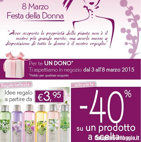 Per quanto riguarda Yves Rocher invece dal 3 all’8 marzo potremo ricevere un dono (non meglio precisato) con ogni acquisto e il 40% di sconto su un prodotto a scelta. Anche in questo caso l’offerta è valida per le clienti con Tessera Fedeltà.
