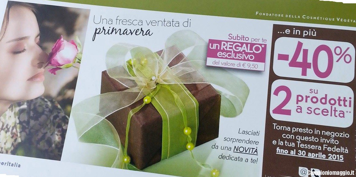 Grazie alla nostra tessera fedeltà Yves Rocher mensilmente riceviamo a casa una cartolina che ci invita a ritirare gratuitamente in negozio un omaggio, diverso ogni mese. Qualche giorno fa abbiamo ricevuto l’invito per ritirare un omaggio a sorpresa del valore di 9,90 e usufruire di uno sconto del 40% su due prodotti a scelta. A noi è stato consegnato un latte corpo da 200 ml al the verde, ma è possibile che l’omaggio sia diverso a seconda dei punti vendita. In ogni caso se avete questa cartolina e la tessera fedeltà Yves Rocher il ritiro non è vincolato da nessun acquisto.