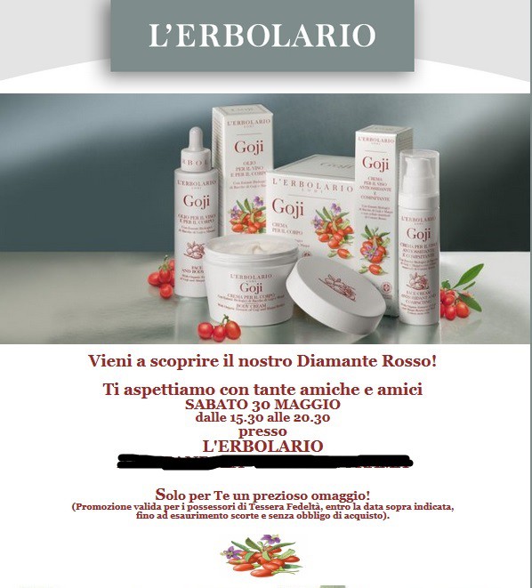 Anche L’Erbolario ha deciso di lanciarsi sul diamante rosso, con una linea alle bacche di Goji che va dal profumo alla crema corpo, dagli oli per il viso all’acqua profumata. Per invitare le sue clienti a scoprire questa nuova gamma di prodotti stanno arrivando alle clienti di alcuni punti vendita degli inviti per ritirare un campione omaggio a sorpresa. L’omaggio verrà consegnato solo ai possessori di tessera fedeltà che hanno ricevuto l’invito. (Non tutti i punti vendita aderiscono)
