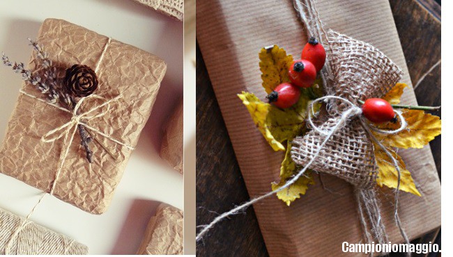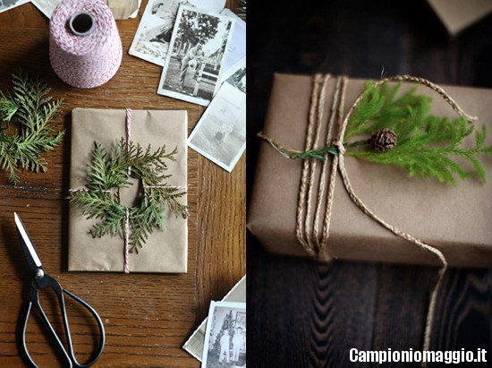 Non c’è niente che come l’aria natalizia ispiri di più alle passeggiate per i boschi e le campagne invernali. Chi ama la natura sarà felice di ricevere un pacco decorato con piccoli elementi naturali, semplici ma di sicuro effetto. Per creare il vostro pacchetto non vi resta che raccogliere piccole pigne, rametti, foglie secche: tutto quello che vi ispira potrà essere un originale decoro per i vostri pacchetti. Per fissarli all’incarto basterà qualche goccia di colla a caldo, mentre a voi non rimarrà che posizionarli con gusto e fantasia e rendere ogni regalo una piccola opera d’arte.