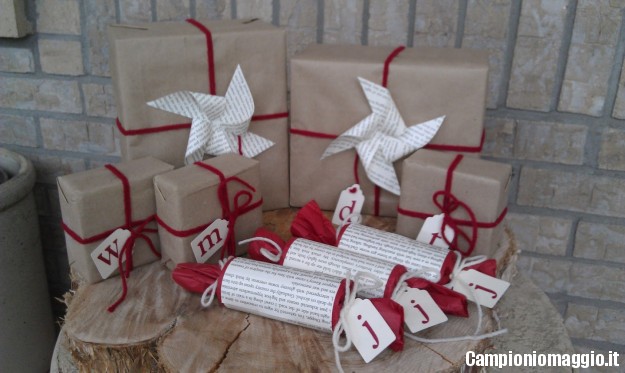 Avete presente la più semplice e classica carta da pacchi? Si tratta dei normali fogli rigati color beige, tradizionalmente utilizzati per spedire i pacchi postali. Forse non avreste mai pensato di utilizzarli per incartare i regali di Natale, ma con un po’ di fantasia e qualche tocco di colore si tratta di un materiale perfetto da usare anche in questa occasione. L’ideale è inserire il regalo in una scatola rigida dalla forma regolare, per facilitare l’operazione di incarto e permettere all’involucro di aderire bene alla confezione. Potete fissare l’incarto con il classico scotch trasparente, ma l’utilizzo del nastro biadesivo, sistemato sotto i bordi del foglio anziché sopra, assicurerà un risultato ancora più piacevole e curato. E ora? Potete sbizzarrivi con l’aggiunta di dettagli colorati, lustrini e decorazioni natalizie, che non solo vi aiuteranno ad abbellire i vostri pacchetti, ma anche a diversificarli e a ricordare cosa avete messo al loro interno. Per esempio, potete giocare con i contrasti e utilizzare – al posto del classico nastro da pacchi – un nastro di raso rosso, in perfetto stile natalizio. L’effetto sarà ancora più bello se aggiungerete qualche adesivo o decorazione nel nodo: un pezzo di passamaneria bianca, verde o dorata, oppure un piccolo ciondolo a tema, magari realizzato in legno e di fattura artigianale.