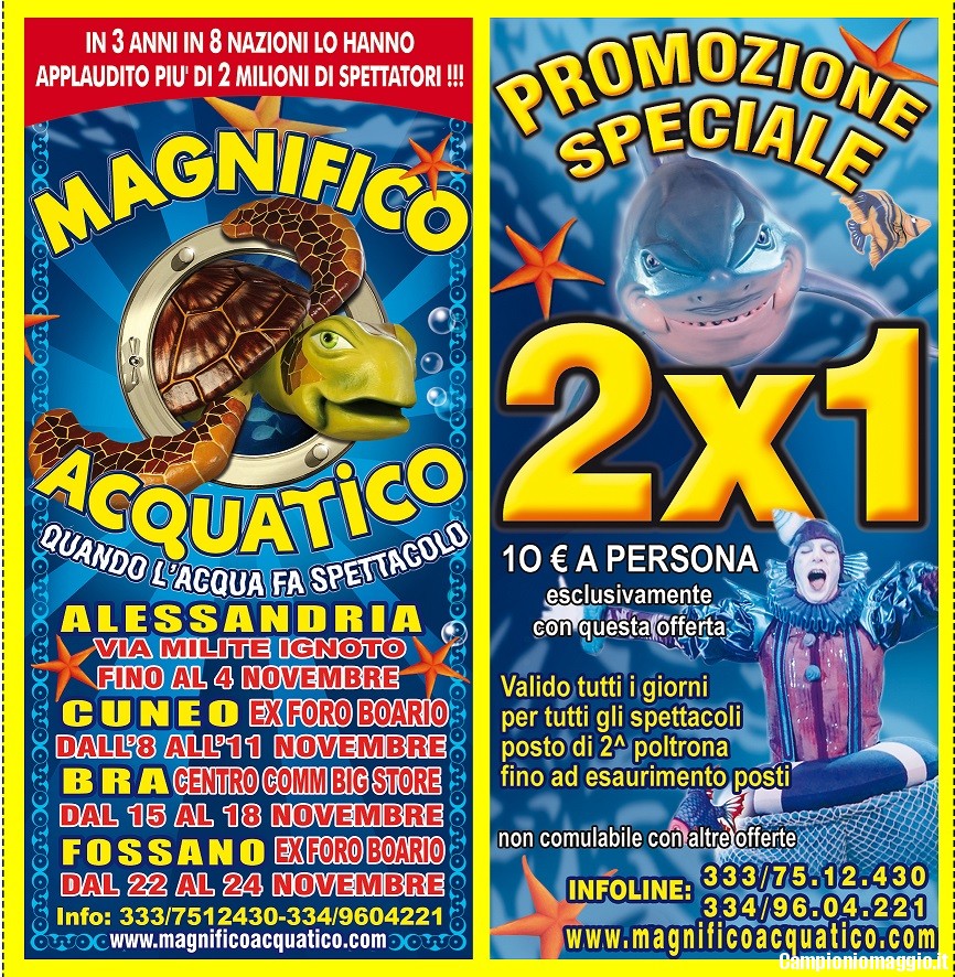 Oggi vogliamo farvi sognare e, perché no, anche tornare un po’ bambini! Vi proponiamo infatti una promozione sull’ingresso al circo Magnifico Acquatico, lo spettacolo record d’incassi in Europa, che per la prima volta, dopo Madrid, Barcellona, Vienna, Atene, Parigi, Roma, Milano e Bergamo farà tappa ad Alessandria fino al 4 novembre, per poi andare a Cuneo, Bra e Fossano.