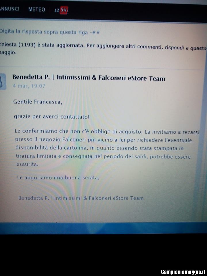 Francesca ha così scritto all’azienda chiedendo delucidazioni e questa è stata la risposta: “Le confermiamo che non c’è obbligo di acquisto. La invitiamo a recararsi presso il negozio Falconeri più vicino per richiedere l’eventuale disponibilità della cartolina”. Quest’ultima infatti è stata prodotta in tiratura limitata e potrebbe essere andata esaurita in alcuni negozi del gruppo.