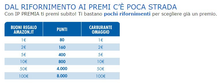 Richiedi la IP Card e ad ogni rifornimento raccoglierai punti, che potrai tramutare in strepitosi premi. Potrai scegliere se richiedere buoni Amazon o se preferisci, puoi convertire i tuoi punti in sconto carburante da IP. Clicca qui per avere maggiori informazioni sulla promo IP. Ecco la tabella di raccolta punti IP: