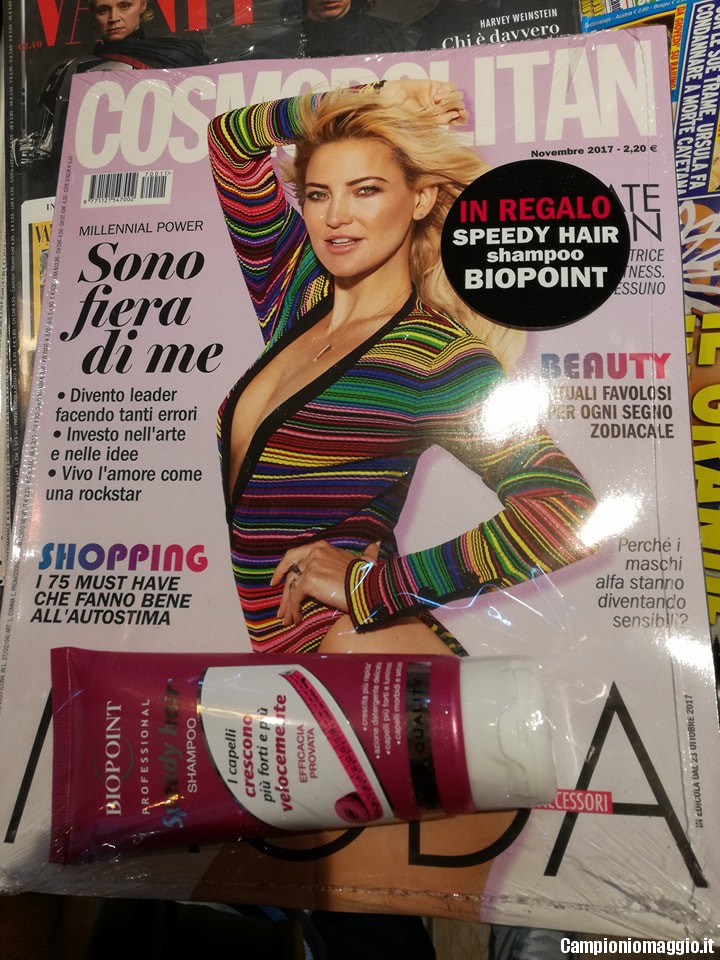 Federica ci segnala che in edicola da oggi (lunedì 23/10/17) è possibile trovare il magazine Cosmopolitan di novembre a €2.20 con shampoo Biopont in omaggio. Lo shampoo in questione è quello della linea Speedy hair, studiata per le donne che desiderano veder crescere i propri capelli più velocemente.