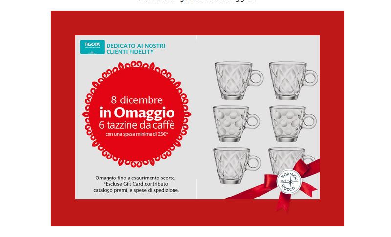 L’8 dicembre in tutti i punti vendita Tigotà e su Tigota.it potrete ricevere in omaggio un set di tazzine da caffè Bormioli, con una spesa minima di 25€. Per ottenere il premio certo dovrete essere in possesso della Carta Fedeltà Tigotà, sottoscrivibile gratuitamente nei punti vendita.