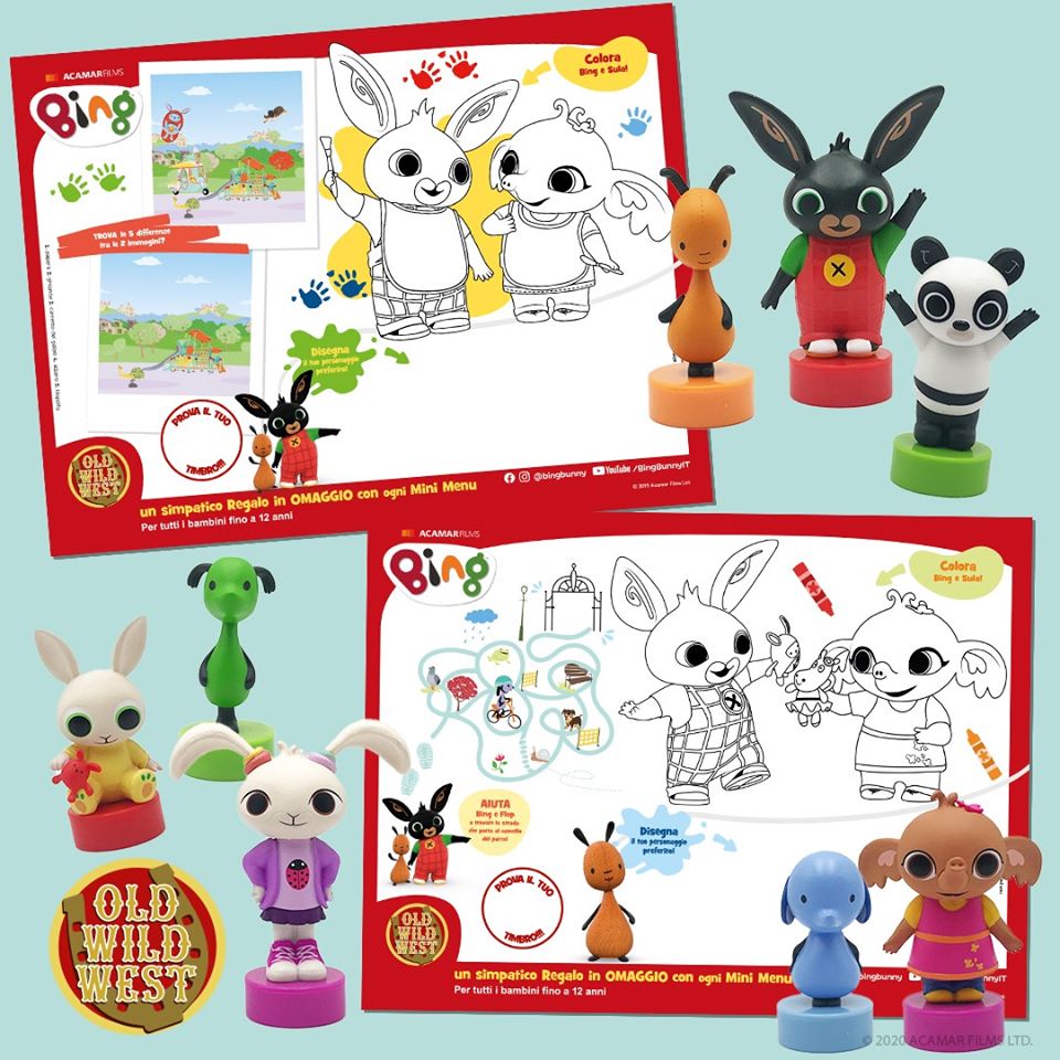 Nei ristoranti Old Wild West potrete trovare un omaggio che sicuramente piacerà ai più piccoli. Con i Mini Menu infatti riceverete i timbrini di Bing, il cartone animato che va in onda su Rai Yoyo, amatissimo dai bambini.