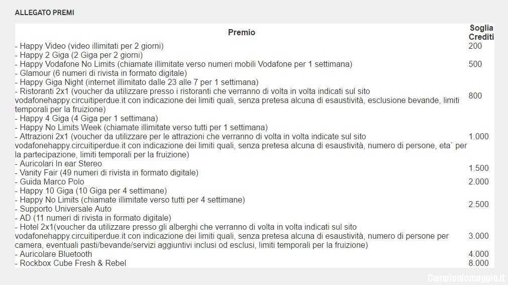 Ecco la lista dei premi che puoi richiedere, aderendo al programma fedeltà Happy Vodafone.