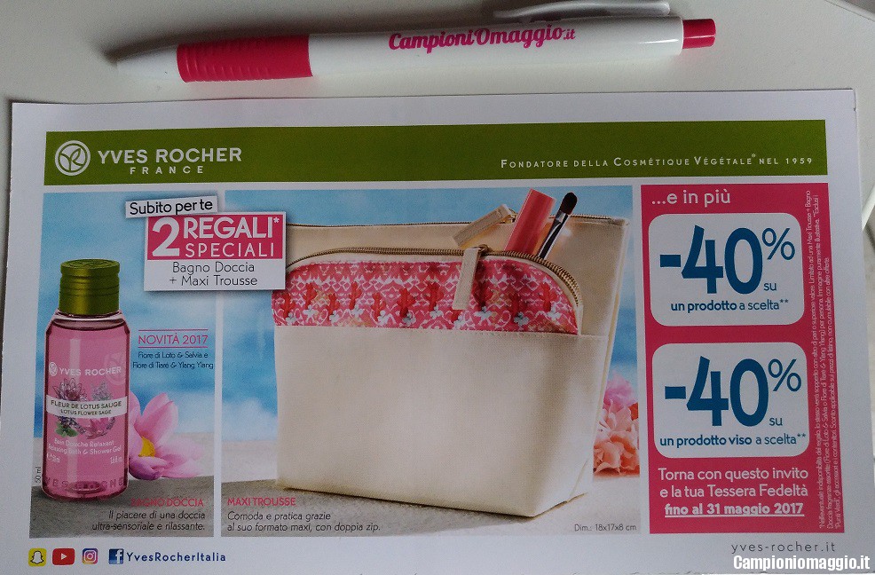 E’ in arrivo la cartolina Yves Rocher di maggio 2017 con un nuovo omaggio da ritirare nei punti vendita monomarca. I campioncini da ritirare sono una pratica trousse e un bagno doccia fiore di loto&salvia. La stessa cartolina funge anche da coupon per avere uno sconto del 40% su un prodotto a scelta e il 40% su un prodotto viso a scelta.
